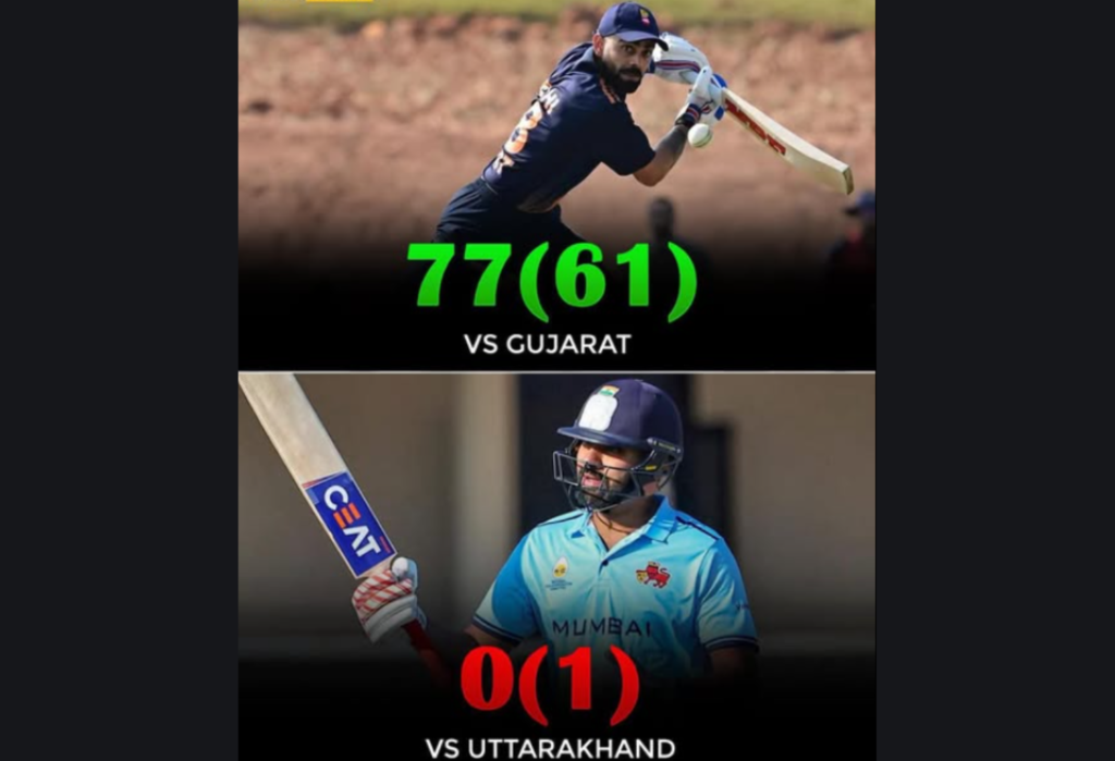 Rohit Sharma had a disappointing outing in the Vijay Hazare Trophy as he was dismissed on the very first ball against Uttarakhand. Devendra Singh Bora took his wicket in the opening over, surprising fans since Rohit had recently scored an unbeaten 155 against Sikkim. In Bengaluru, Virat Kohli continued his good form for Delhi, hitting 77 runs from 61 balls with 13 fours and a six in the match against Gujarat.